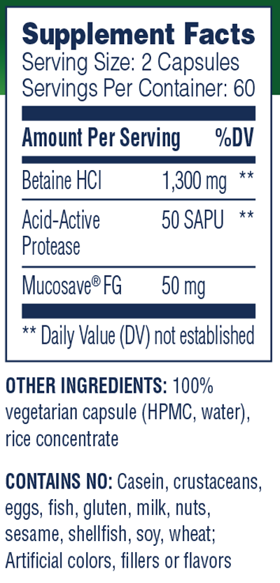 Betaine HCl is formulated with a gentle potency of hydrochloric acid, protein-digestive enzymes, and soothing herbs to assist with low stomach acid and soothe occasional heartburn/indigestion while protecting the lining of the stomach.*Betaine HCl also features Mucosave® FG to support and maintain a healthy mucosal system in the stomach.* Mucosave® FG is a patented and clinically studied blend of prickly pear and olive leaf extracts that have been shown to have protective effects by creating a barrier in the lining of the stomach.*
