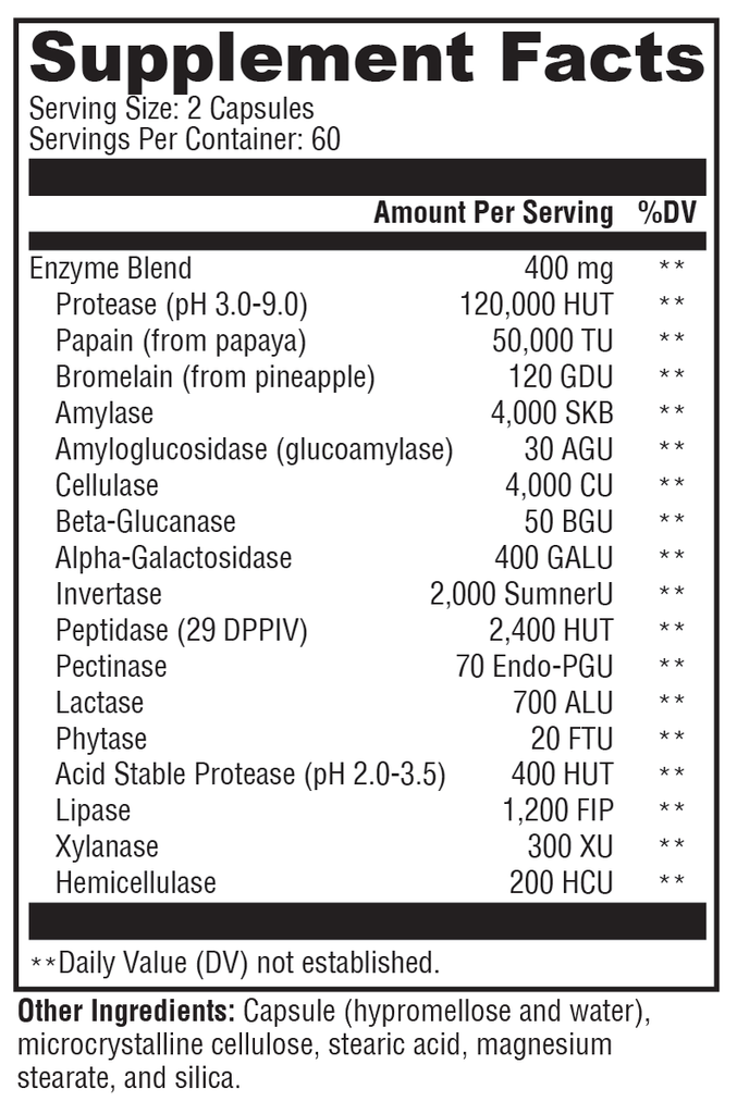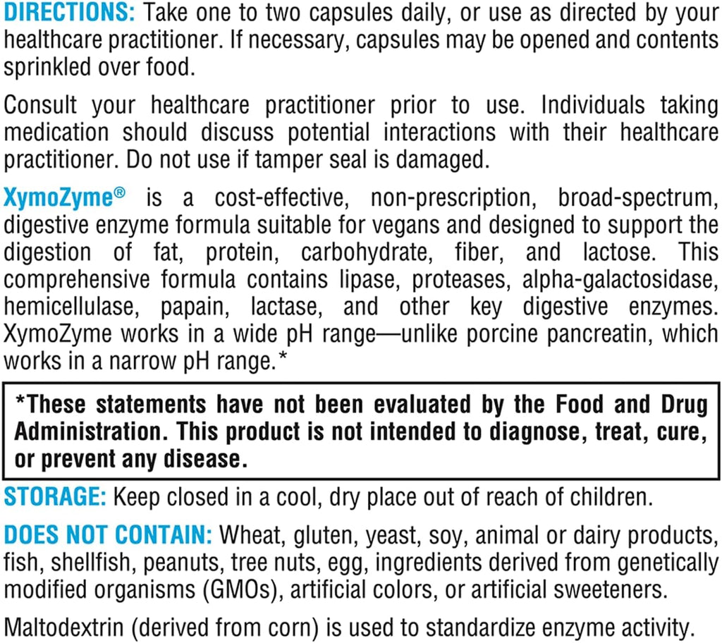 XymoZyme® is a cost-effective, non-prescription, broad-spectrum, digestive enzyme formula suitable for vegans and designed to support the digestion of fat, protein, carbohydrate, fiber, and lactose. This comprehensive formula contains lipase, proteases, alpha-galactosidase, hemicellulase, papain, lactase, and other key digestive enzymes. XymoZyme works in a wide pH range—unlike porcine pancreatin, which works in a narrow pH range.*