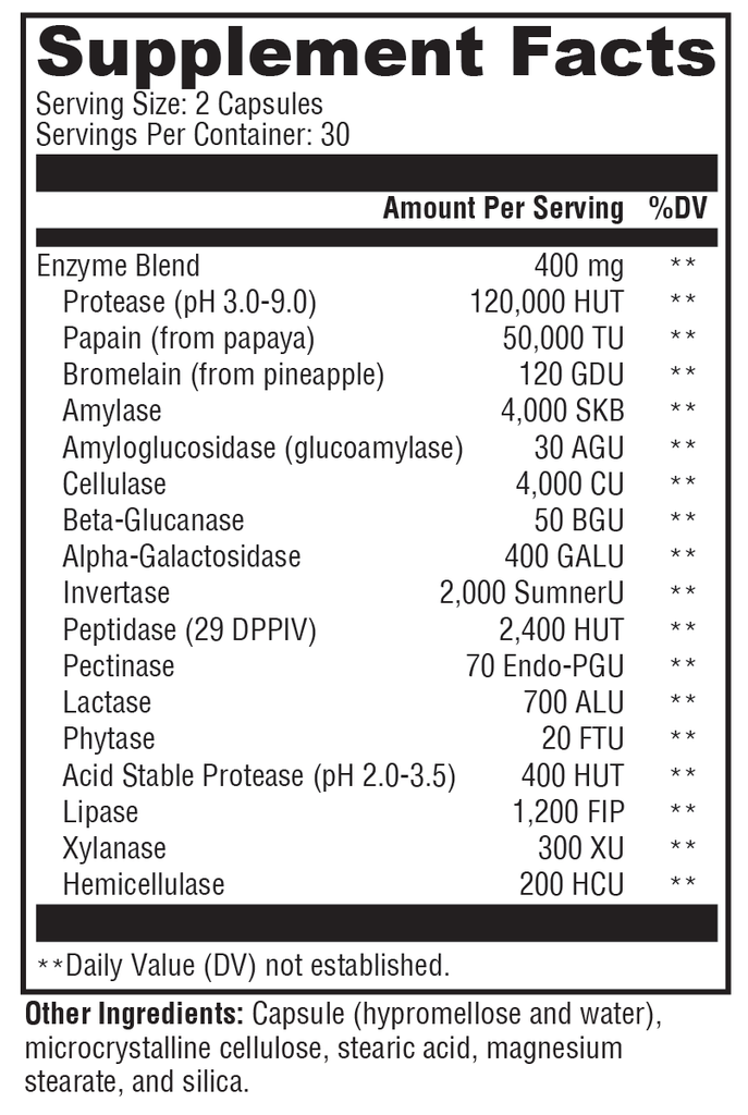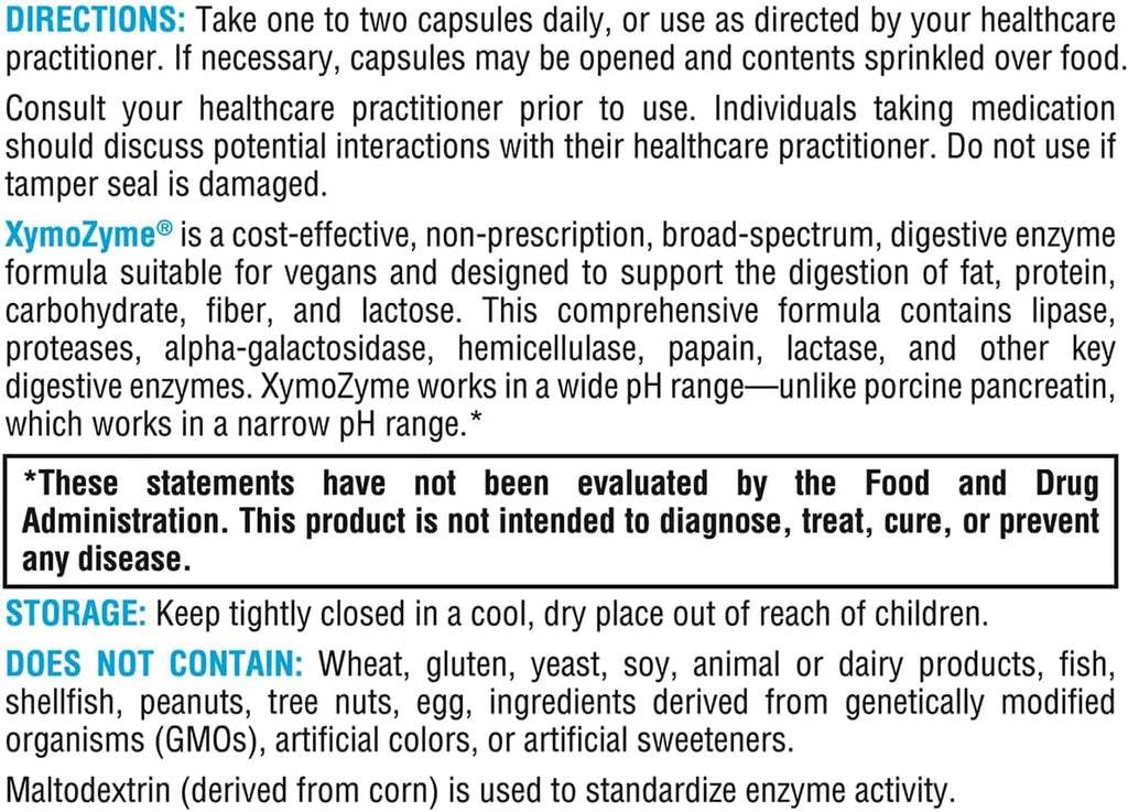 XymoZyme® is a cost-effective, non-prescription, broad-spectrum, digestive enzyme formula suitable for vegans and designed to support the digestion of fat, protein, carbohydrate, fiber, and lactose. This comprehensive formula contains lipase, proteases, alpha-galactosidase, hemicellulase, papain, lactase, and other key digestive enzymes. XymoZyme works in a wide pH range—unlike porcine pancreatin, which works in a narrow pH range.*
