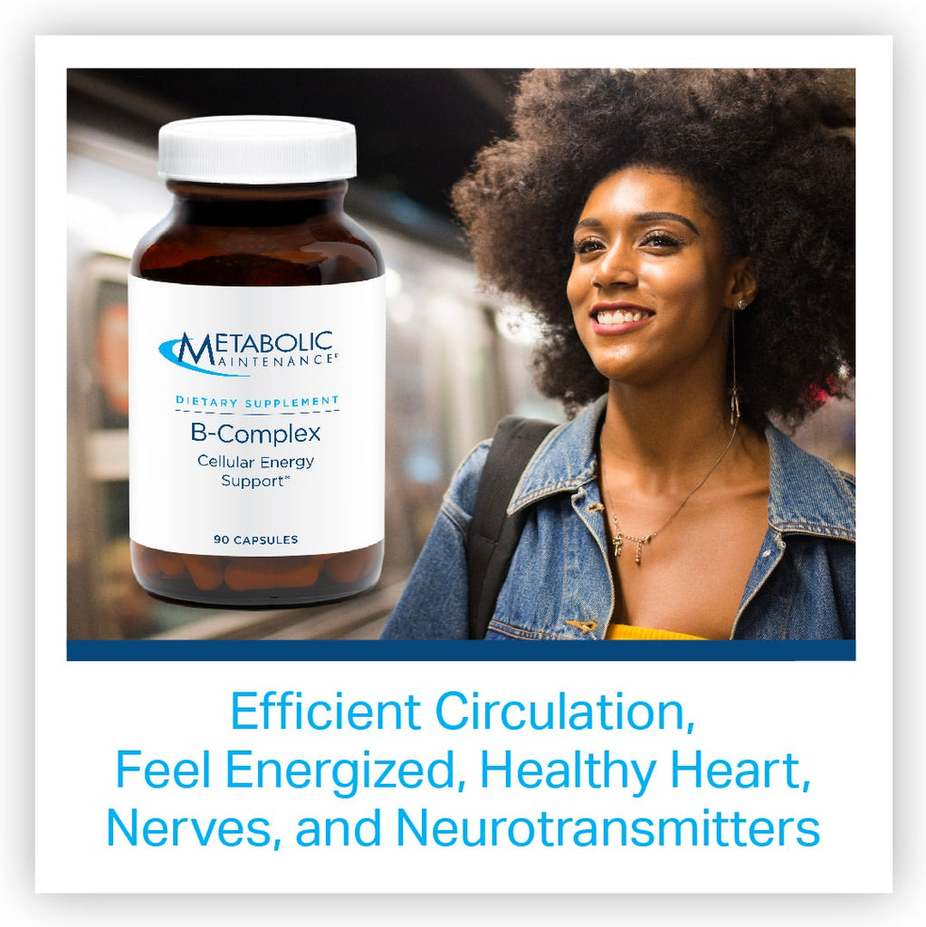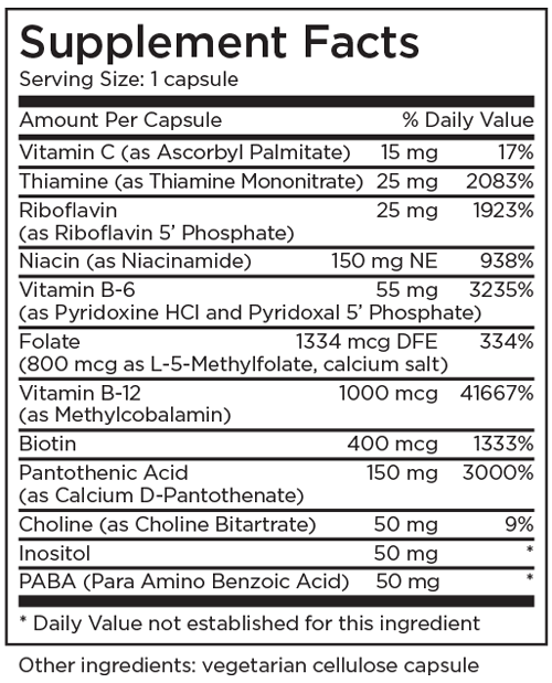 Our high potency B-Complex formula provides all eight essential B vitamins, plus choline, inositol, and PABA. Though each ingredient has unique roles in the body, they work together to support mood, energy production, nerve function, and a healthy cardiovascular system. Our B-complex contains the active, phosphorylated forms of B-2 (Riboflavin) and B-6 and the methylated forms of B-12 and L-methylfolate for superior bioavailability and maximum benefit.*