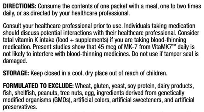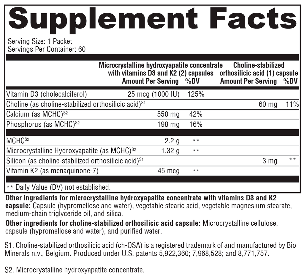 Each packet contains: 2 Microcrystalline Hydroxyapatite Concentrate with vitamins D3 and K2 capsules and 1 Choline-stabilized orthosilicic acid capsule.