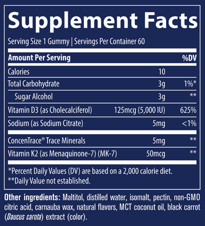 Vitamin D3 + K2 gummies are a delicious pairing of two essential nutrients that each function more effectively in the presence of the other. When combined, these two highly bioavailable ingredients help support strong and healthy bones, heart health, and immunity.*