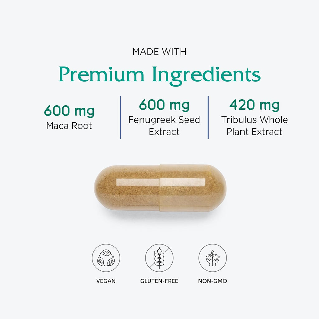 • Fenugreek also shows in research to promote free testosterone and estradiol and shows support of libido ‐ desire and arousal*