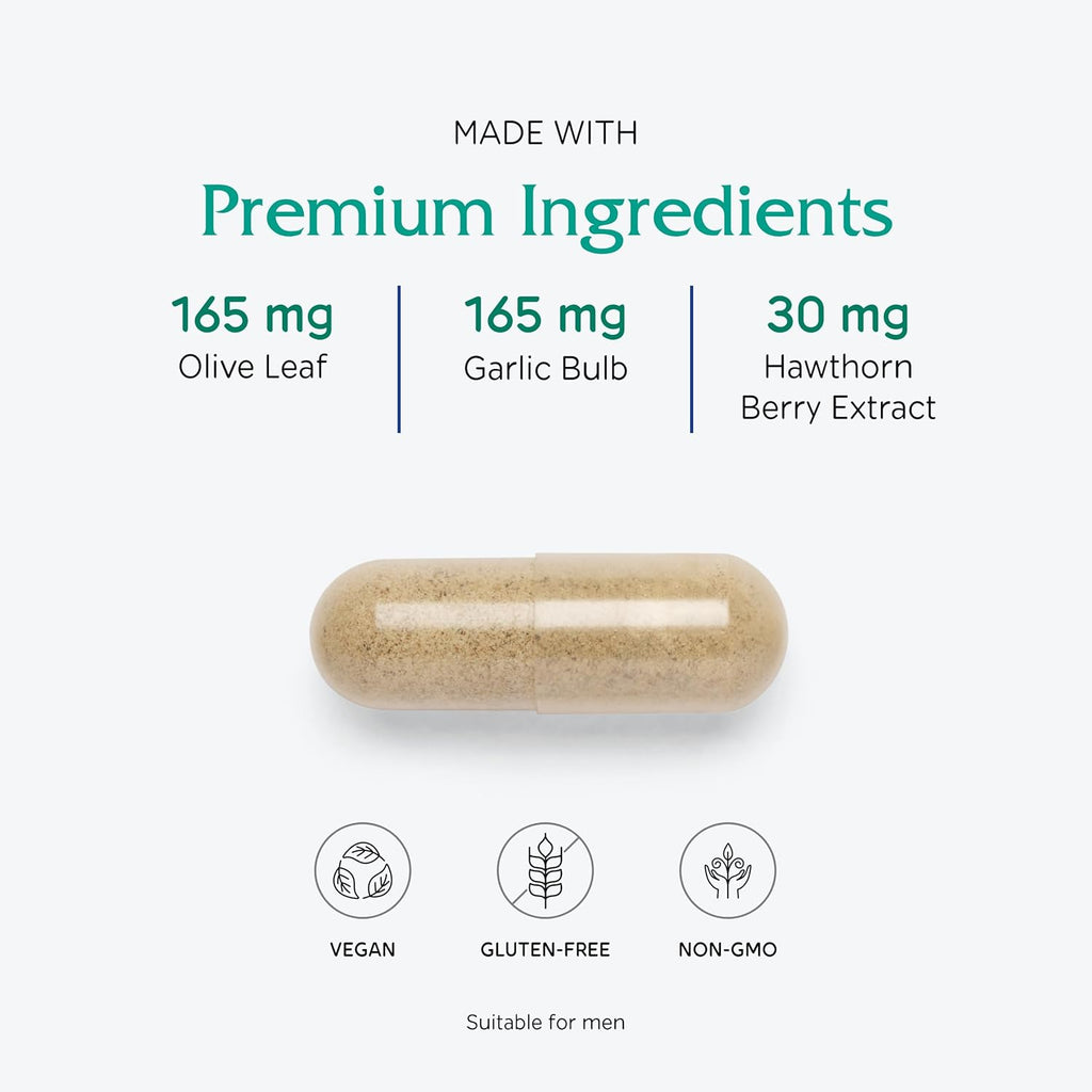 - Other supportive botanicals: Olive leaf, Garlic, Hawthorn berry, Hibiscus flower and Dandelion leaf*